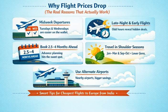 Countries like Germany, Poland, and Hungary usually have the lowest entry fares from India. Choosing midweek flights and avoiding peak travel months can help you save a lot.