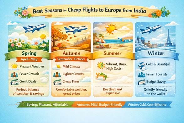 The best months when there are fewer people, lesser chaos, and the best prospects of getting the cheapest flights to Europe from India are January to March and September to October.