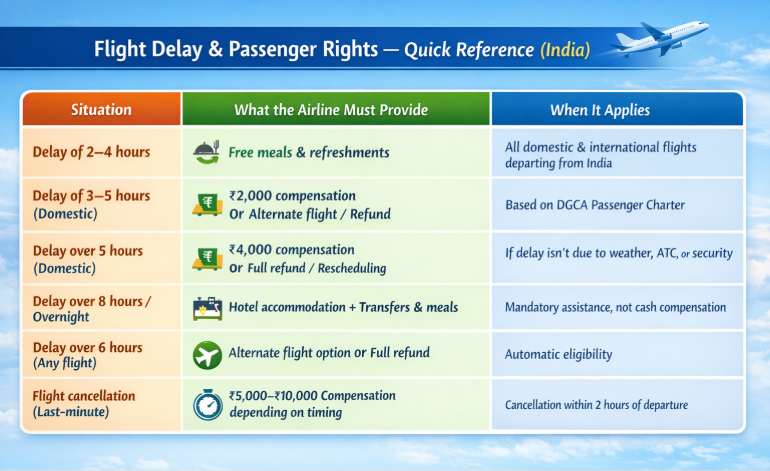 The DGCA Passenger Charter says if a delay is over 2-4 hours (depending on flight length), the airline must provide meals. If it’s an overnight delay or more than 6 hours, they must provide a hotel or a full refund if you choose not to fly.