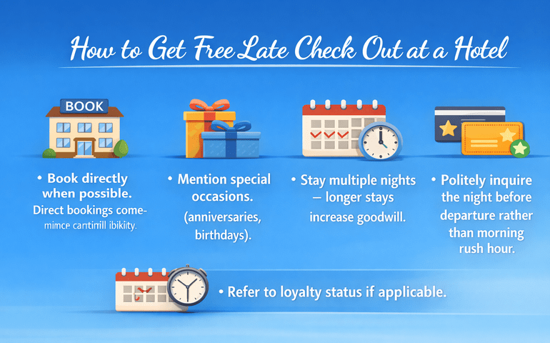 These steps increase the probability of securing late check out at hotels without additional cost, particularly in business districts and airport hotels.