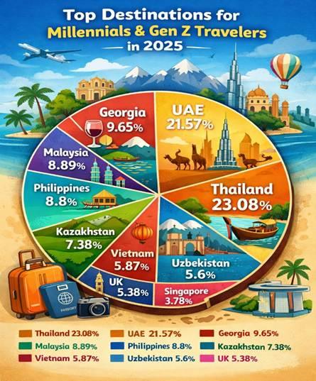 Millennials gravitate toward destinations that offer a mix of relaxation and experiences, such as Thailand, Europe, and the UAE. They prefer places with good food scenes, nightlife, nature, and reliable infrastructure.